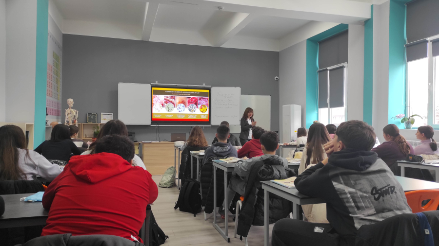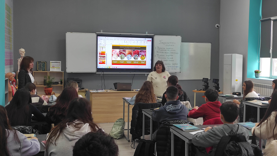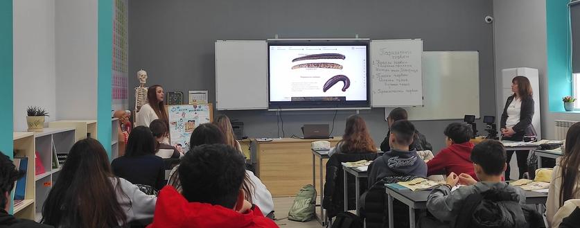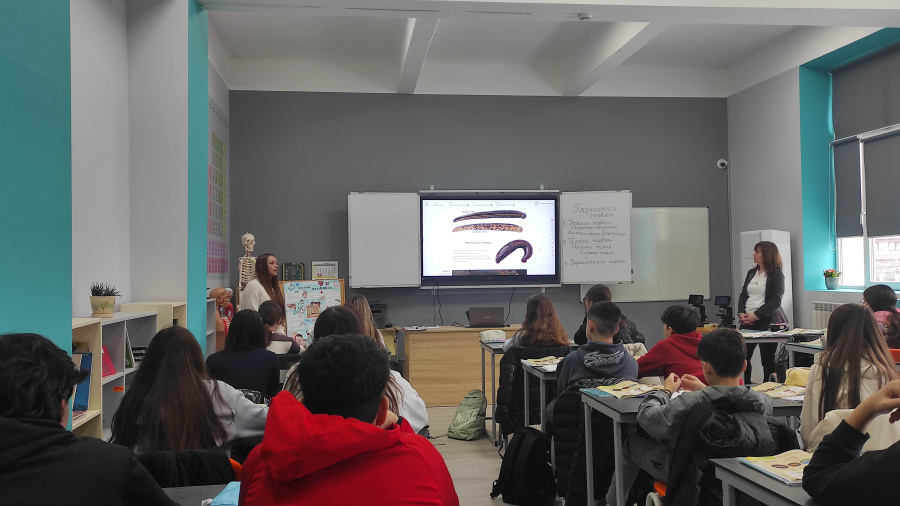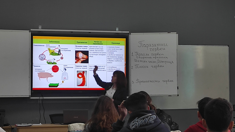През предходната седмица в кабинета по природни науки, част от новия STEM център, се проведе един интригуващ учебен час в 7а клас. Учителят по биология г-жа Марияна Панайотова представи открит урок на тема: „Паразитни червеи“.